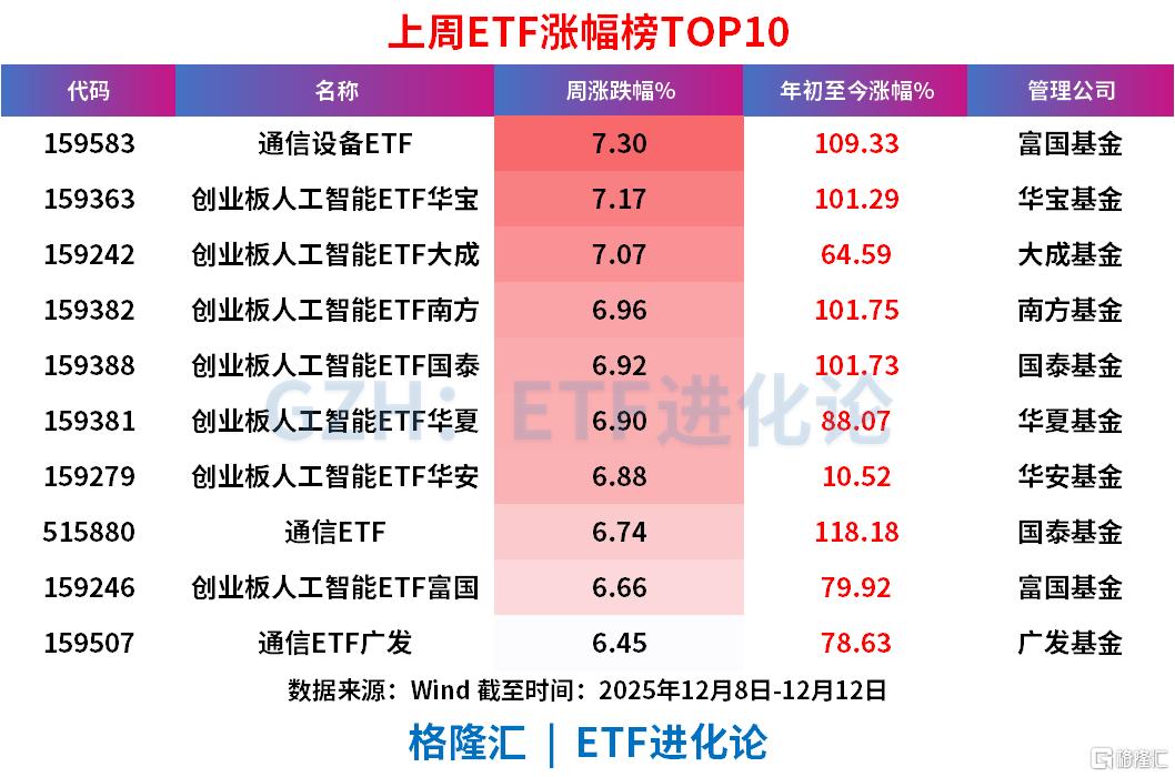 通信设备ETF、创业板人工智能ETF华宝、创业板人工智能ETF大成、创业板人工智能ETF南方、创业板人工智能ETF国泰上周分别涨7.30 %、7.17 %、7.07 %、6.96 %、6.92 %、