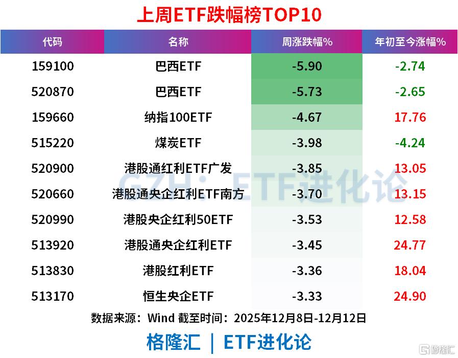 巴西ETF、巴西ETF、纳指100ETF、煤炭ETF、港股通红利ETF广发上周分别跌5.90%、5.73%、4.67%、3.98%、3.85%。