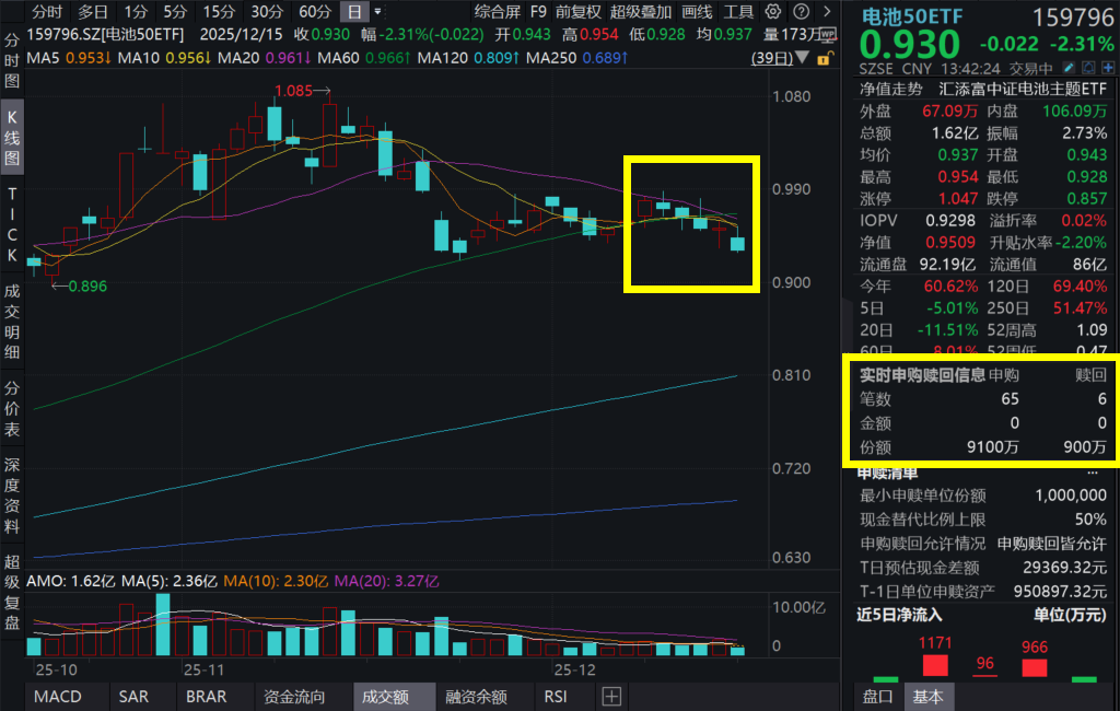 12月15日,A股市场震荡回调,截至13:46,同类规模领先、费率最低档的电池50ETF(159796)跌超2%,资金逢跌汹涌布局,电池50ETF(159796)盘中获净申购8200万份,以盘中成交均价计算,合计净流入超7600万元!