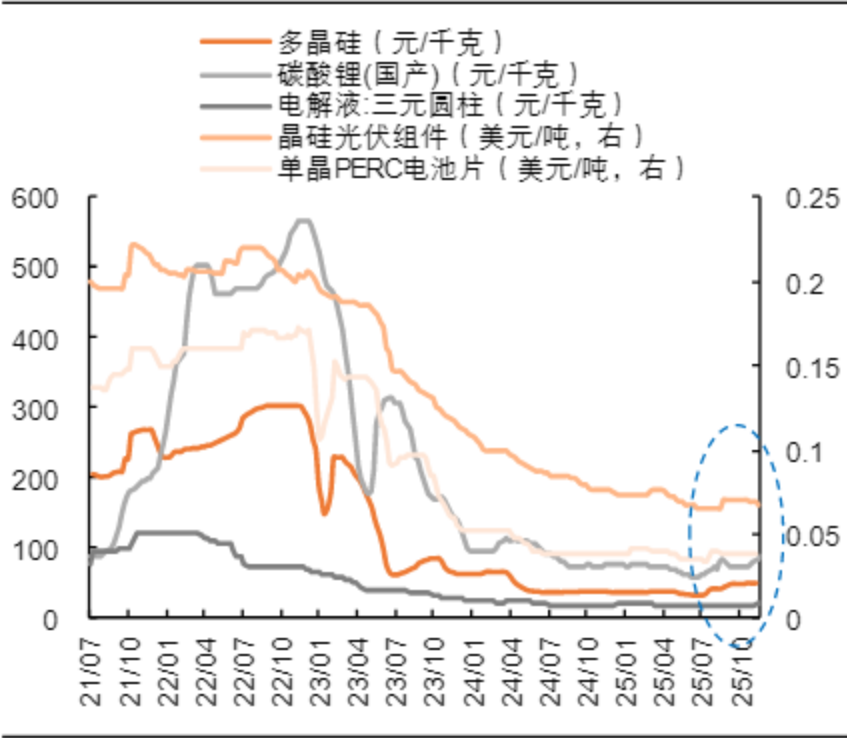 平安证券指出,供给端来看,“反内卷”治理推动行业供给格局改善,相关产品涨价有望改善企业盈利。在2025年“反内卷”治理、行业自身持续约两年底部出清的背景下,2025年新能源行业供给格局逐步改善,电池、光伏产业链产品价格自年中以来已有企稳,后续继续关注产品涨价的持续性。