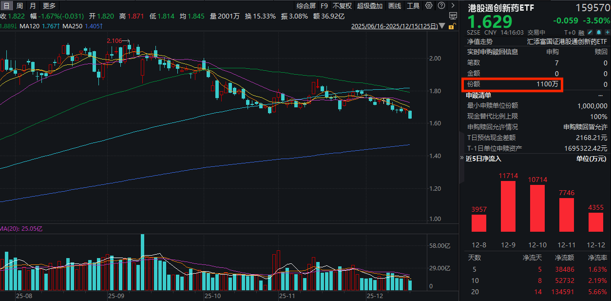 今日(12.15),港股市场震荡调整,港药深度回调,创新药纯度100%的港股通创新药ETF(159570)跌超3.5%刷新阶段新低,盘中成交额超13亿元!资金面上,盘中“吸金”超1800万元,近10日累计净流入超5.2亿元!截至12月12日,港股通创新药ETF(159570)最新规模超234亿元,同类持续领先!
