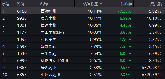港股通创新药ETF(159570)标的指数权重股多数飘绿:百济神州、翰森制药跌超7%,康方生物跌超6%,信达生物跌超4%,中国生物制药跌超3%。