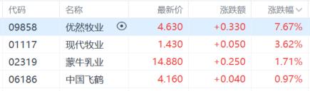 港股中,优然牧业涨超7%,现代牧业涨超3%,蒙牛乳业涨找1%。