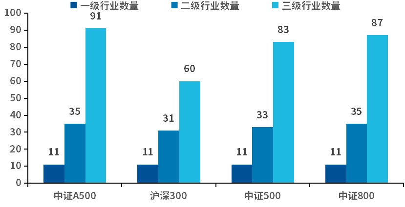 2025年6月的调整在上述基础上进行了“结构微调与再平衡”。增配工业、可选消费、房地产行业可以更好反映经济企稳复苏的趋势,同时对信息技术、通信服务、医药卫生、原材料等行业内部进行更新,新纳入成份股如沃尔核材、赛维时代等。第二次定期调整后,中证指数公司表明,A500指数对新兴行业的占比升高至约46.5%,对“新质生产力”的表征性进一步提升。至此,指数覆盖的二级、三级行业数量分别为35个和91个,远多于沪深300、中证2000等宽基指数,体现出了行业充分均衡的特点。