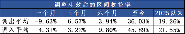 2025年6月的调整期,调整后一个月、三个月及至今,调入股票组的平均收益分别为6.12%, 24.93%, 24.55%,均优于调出股票5.38%, 18.29%, 18.95%。
