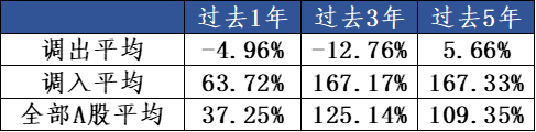 本轮调整或具有相同效果。虽然无法得知未来表现,但拟调入股票过去1年、3年、5年的平均涨幅分别约为64%, 167%, 167%,远超市场同期平均水平,也远超拟调出股票的历史表现。这表明调入公司普遍具备更强的长期盈利能力,为指数未来的收益表现注入了优质基因。