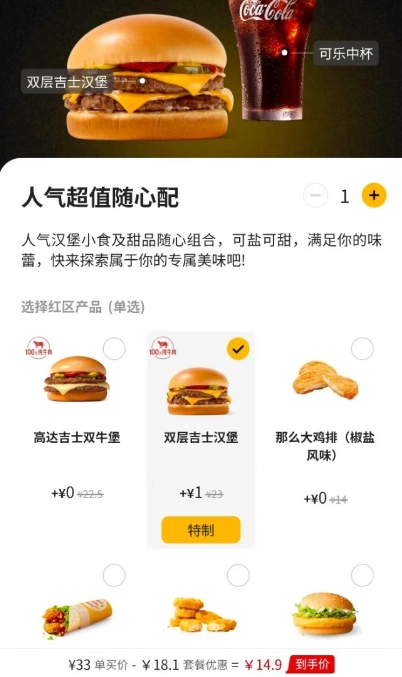 对于此次涨价,麦当劳在具体布置上十分“微妙”,至于外界十分关注的麦当劳“穷鬼套餐”1 1随心配仍维持13.9元起的定价,不过其中搭配不同的单品出现了1元涨幅的组合方式。