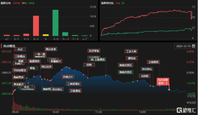 12月15日,沪深两市成交额1.77万亿,较上一个交易日缩量3188亿。板块方面,商业航天、乳业概念、保险等板块涨幅居前,而CPO概念、船舶制造、激光雷达等板块下挫。