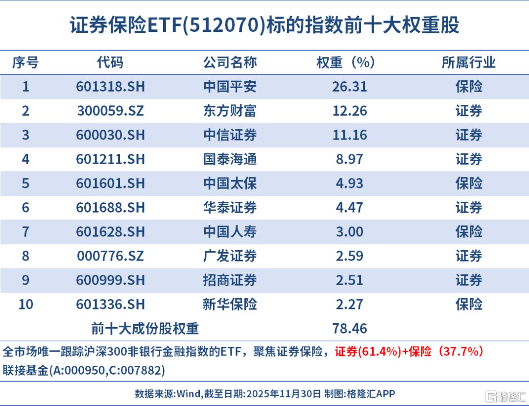 比如证券保险ETF(512070),是全市场唯一跟踪沪深300非银行金融指数的ETF,该指数证券含量61.4%,保险占比37.7%,是全市场聚焦A股保险含量最高的ETF标的指数,权重股包括中国平安、东方财富、中信证券、国泰海通、中国太保、华泰证券、中国人寿、广发证券、招商证券、新华保险等行业龙头公司,前十大成份股合计权重超78%,龙头集中度较高。