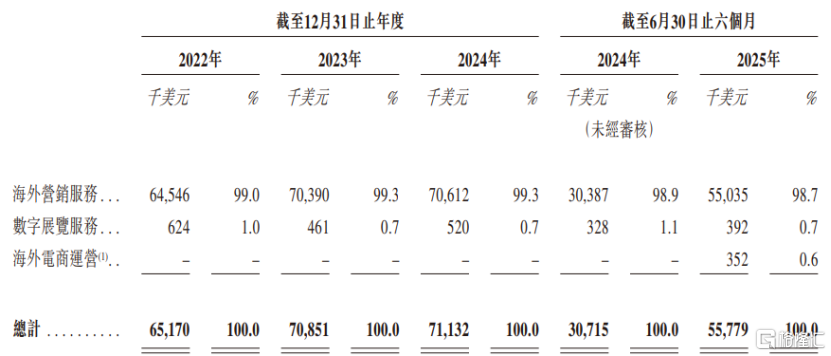 具体来看,2022年至2025年上半年(简称“报告期”),海外营销服务为米多多贡献了98%以上的收入,为重要收入来源。