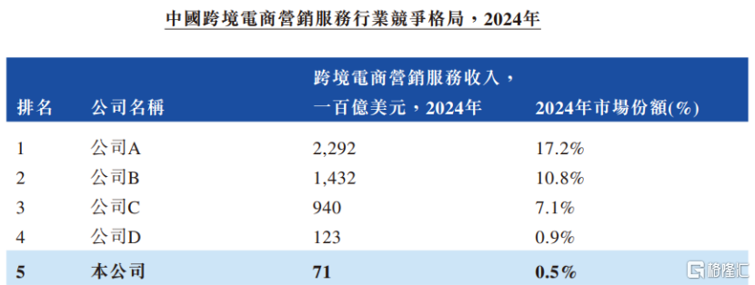 据灼识咨询的资料,2024年五大市场参与者占市场总份额约36.5%。其中,按2024年跨境电商营销服务收入计,米多多为中国第五大跨境电商营销服务提供商,市场份额仅为0.5%。