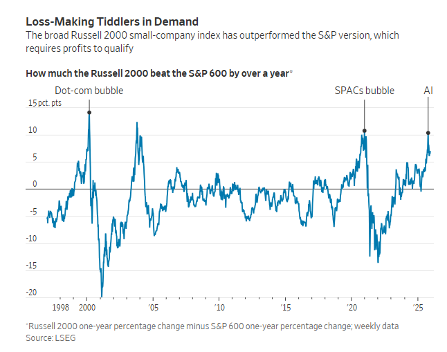 这一趋势体现在小盘股指数的表现上。过去一年截至10月中旬,罗素2000指数(涵盖小市值公司)跑赢标准普尔600(只包含盈利公司)10个百分点。历史上这种幅度的超越只发生过三次:1999–2000年、2020–2021年,以及2002年互联网泡沫破裂后的反弹。