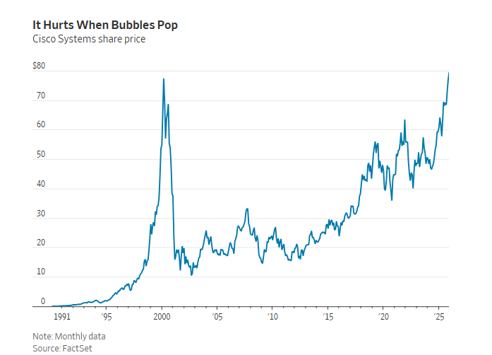 本周,思科股价再度触及2000年3月互联网泡沫顶峰时的历史高点。当年,这家“互联网时代的冠军”曾一度成为全球市值最高的公司,是一个关于股价如何远离现实的警示故事。