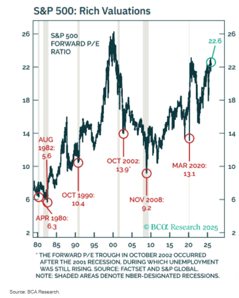 人工智能的乐观叙事破裂时,股市正处于脆弱状态。BCA指出,标准普尔500指数在2026年初的远期市盈率为22.6倍,远高于中位值18倍。