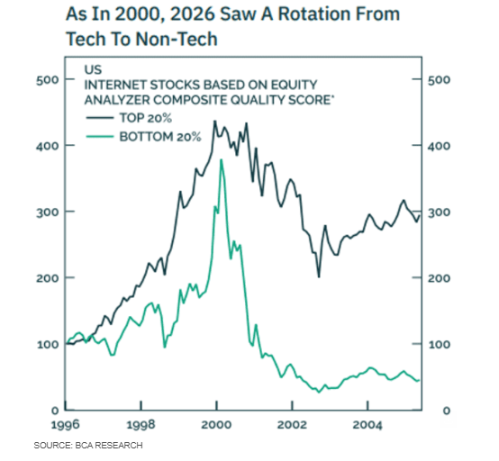 但并非所有观察人士都如此乐观。BCA Research在最新报告中认为,纳斯达克的大型科技公司将在2026年成为股市的主要拖累。