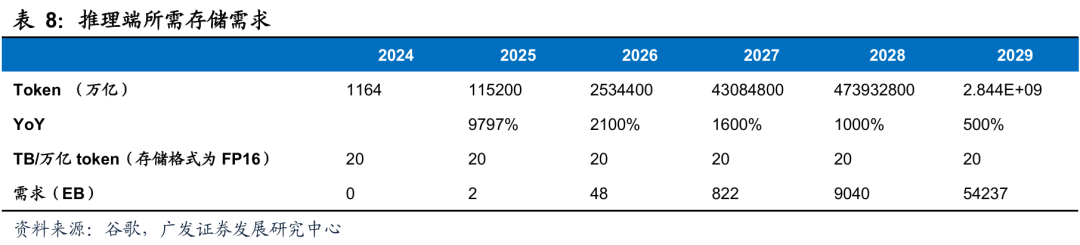 广发证券最新测算数据也印证了,AI推理驱动AI存储快速增长。(1)内存受益于超长上下文和多模态推理需求,处理大量序列数据或多模态信息时,高带宽与大容量内存可降低访问延迟、提升并行效率。(2)SSD和HDD是Tokens的积分。我们对推理所需SSD、HDD需求进行测算,基于以下关键假设:假设一、参考谷歌2025.06单月处理超980万亿tokens,假设中短期内全球谷歌级推理应用数量达到10个;假设二、假设推理端数据均存储为FP16格式;假设三、除模型输入输出文本数据以外,在长上下文场景下,存储数据也包含额外调试/分析信息,比如top-kloglogprobs、时间戳、JSON元数据等。由此测算,2026年10个谷歌级推理应用所需存储容量为48EB。