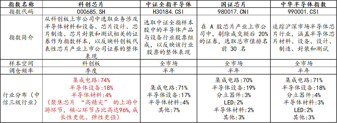 市场上芯片相关指数众多,选取当下热门的科创芯片、半导体等指数进行比较,可以发现,虽然均聚焦为芯片板块,但在指数编制上却大有不同。一句话总结:科创芯片指数聚焦芯片核心环节,“含芯量”更高,弹性强,成长性高。