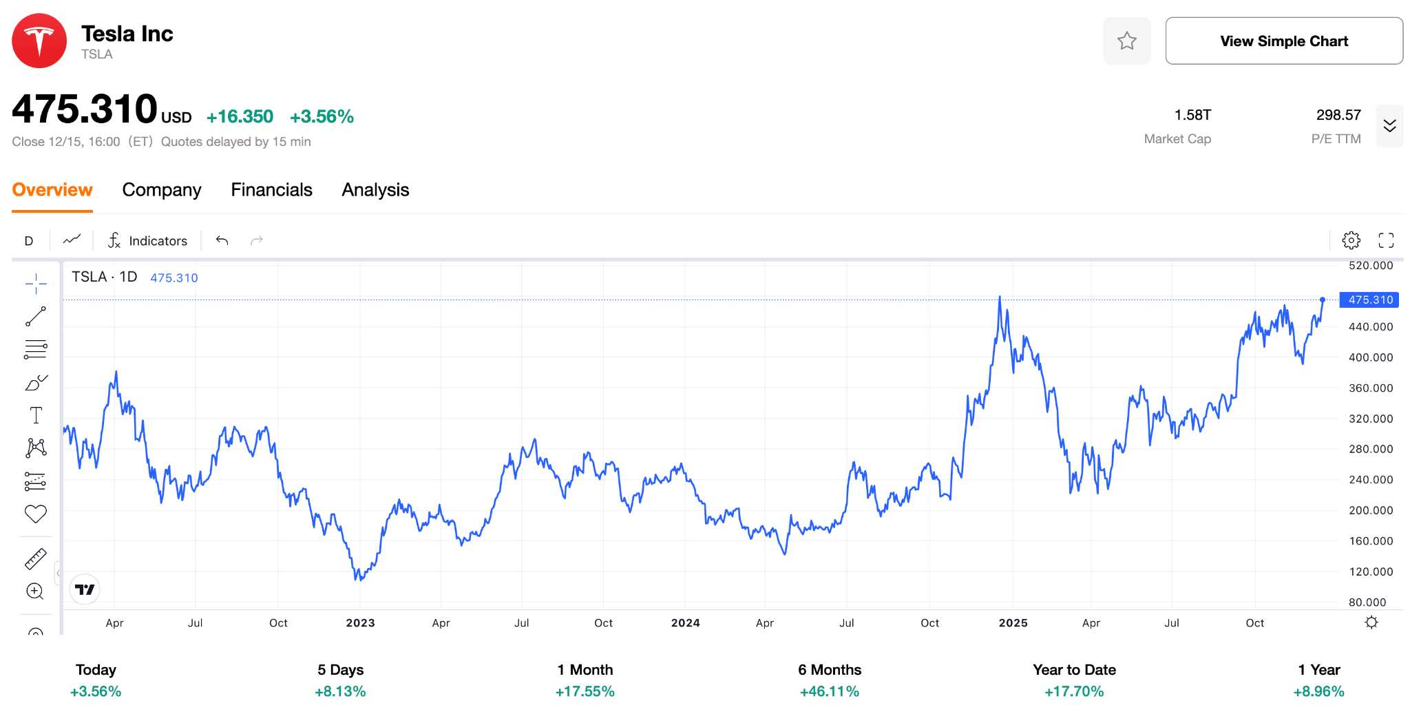 TradingKey - 当地时间12月15日,特斯拉股价一度上扬近4.9%,盘中最高触及481.77美元,创下近一年内最高水平,同时再次逼近历史高点。同时也将CEO埃隆·马斯克(Elon Musk) 的个人财富推向新的高度。