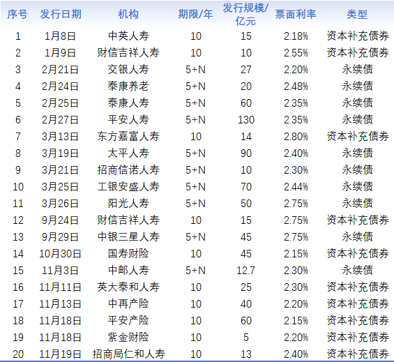 11月已有6家险企集中发行债券,其中平安产险60亿元、中再产险40亿元、英大泰和人寿25亿元资本补充债相继落地,紫金财险、招商仁和人寿也完成小额资本补充债发行,仅中邮人寿发行12.7亿元永续债,年末“补血”冲刺态势明显。