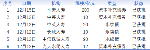 发债节奏呈现 “年末密集” 特征,进入12月,监管部门又在近期集中批复了多家保险公司的发债申请,涉及五家险企,总规模不超过342亿元。