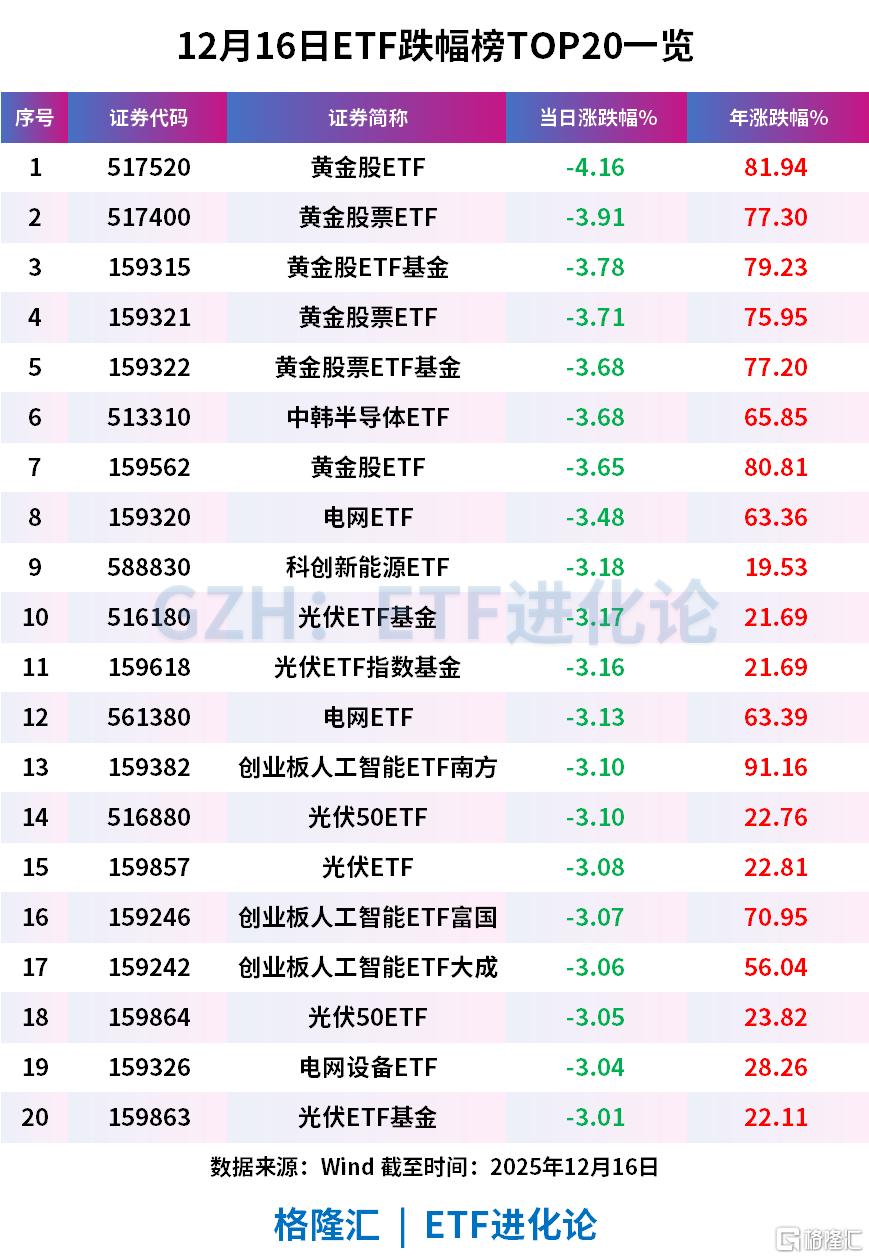 今日的贵金属板块同样遭遇重挫,黄金股ETF、黄金股票ETF和黄金股票ETF基金分别跌4.16%、3.91%和3.78%。