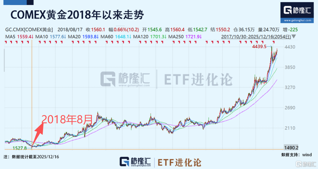 2018年开始,一条古老、沉默的曲线开始苏醒,代表人类最原始价值的黄金展开了一场沉默而坚定的攀升,7年时间里,从1527美元到4300美元。