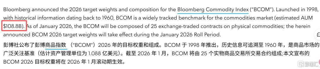 为了弄清楚黄金、白银再平衡究竟有多少卖盘,我们需要三个数据:①BCOM的被动基金跟踪规模②目前黄金、白银在指数的权重③黄金、白银在2026年的目标权重。