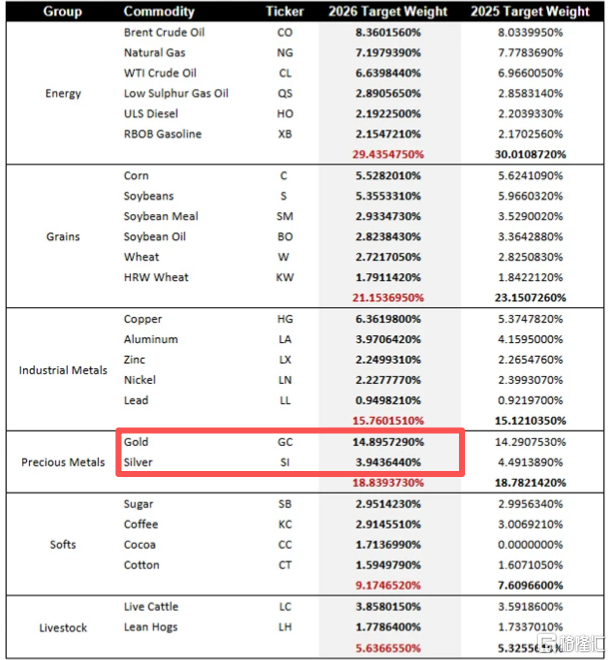 原因是摩根大通12月12日发布的全球大宗商品研究报告显示,备受关注的彭博商品指数(BCOM)即将在2026年1月进行年度权重再平衡,其中: