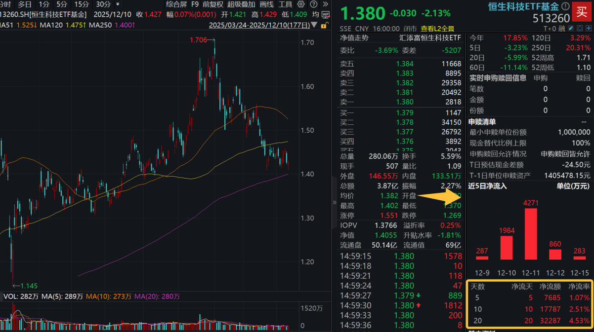 同类唯一15BP最低档管理费的恒生科技ETF基金(513260)亦收跌超2%,全天成交额超3.8亿元。资金面上,已连续33个交易日获资金青睐,累计净流入超5亿元!恒生科技ETF基金(513260)最新规模达70.48亿元,基金最新融资余额近1.6亿元。