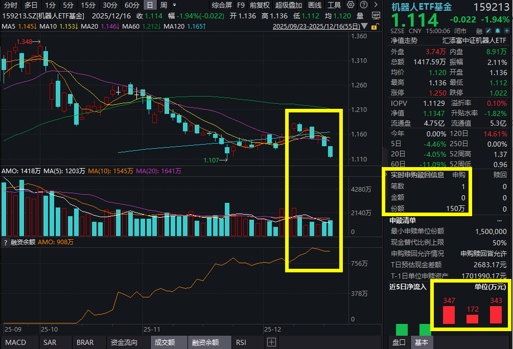 12月16日,A股市场跌幅较大,机器人板块再度承压,截至收盘,机器人ETF基金(159213)跌1.94%,延续昨日回调趋势,弱势两连阴。机器人ETF基金(159213)全天再获近200万元净申购,加上今日机器人ETF基金(159213)已连续4日“吸金”超1000万元!