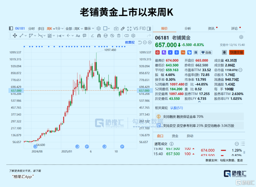 2024年6月上市后,老铺黄金创造了股价一年暴涨20倍的增长奇迹,股价一度超过1000港元/股,成为港股股王。