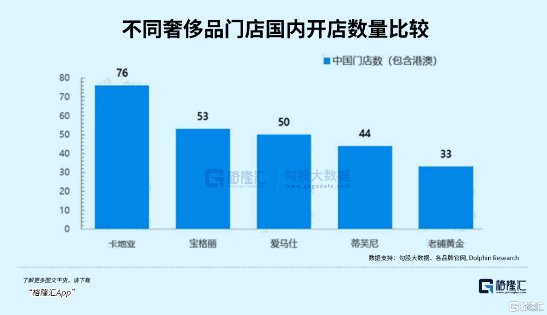 由于其门店只能开设在数量有限的顶奢商场,根据估算,包含港澳在内,老铺在国内的潜在开店上限约为67家,和卡地亚、宝格丽、爱马仕等国际奢侈品在国内的开店数量相近,约为当前门店数的两倍。