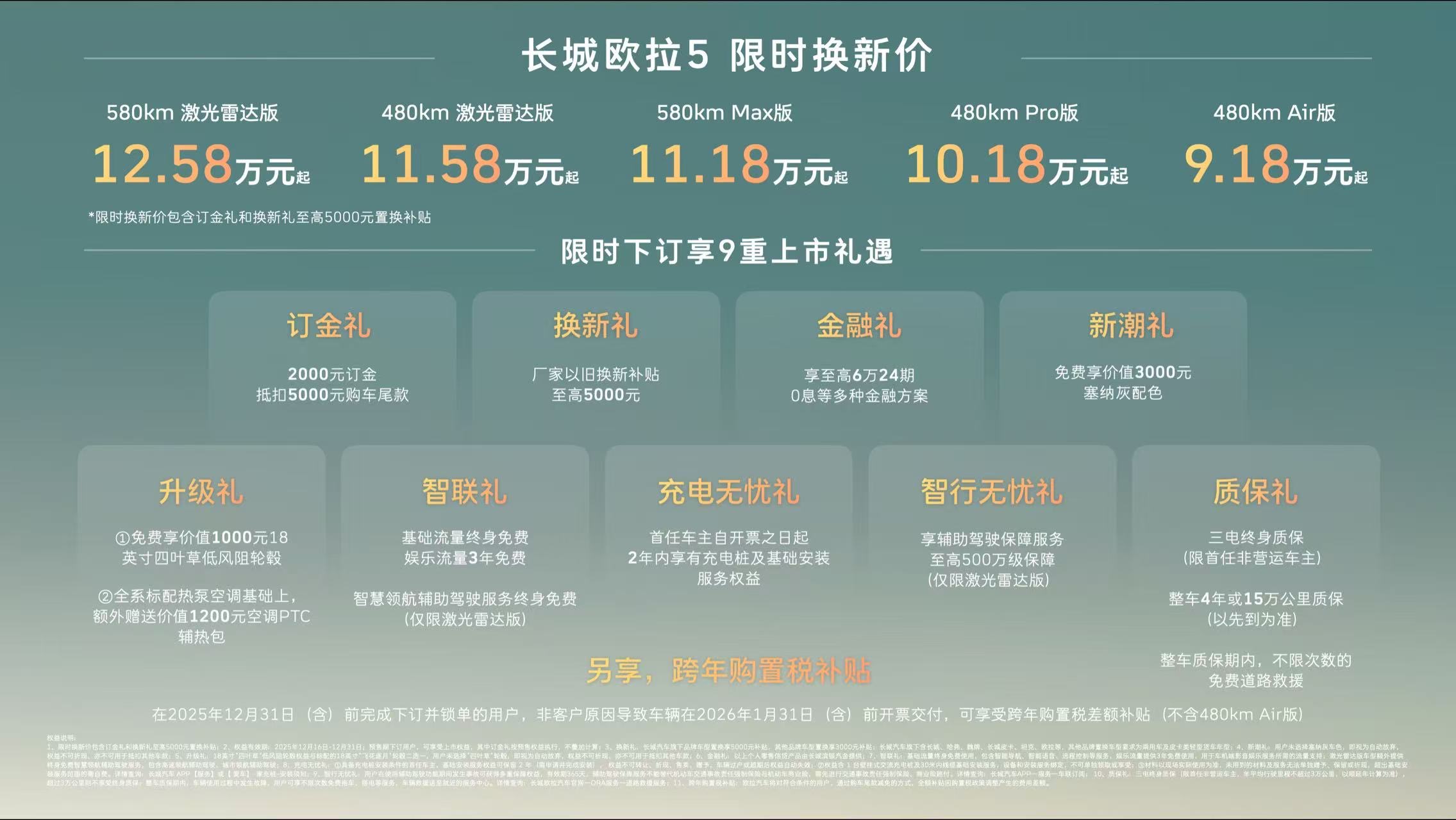 【中国·保定】2025年12月16日——今日,长城汽车欧拉品牌全新A级纯电SUV——长城欧拉5正式上市。新车共推出5款配置,建议零售价区间为9.98万至13.38万元,限时换新价9.18万元起(限时换新价包含“订金礼”和“换新礼”至高5000元以旧换新补贴)。为回馈广大用户的热爱与支持,即日起至2025年12月31日,用户下订并锁单即可尊享包含订金礼、换新礼、智行无忧礼在内的9重上市好礼,以及跨年购置税补贴(不含480km Air版)等丰厚购车权益。凭借诚意十足的价格权益与越级产品力,长城欧拉5致力于成为全球年轻用户的“严选搭子”。