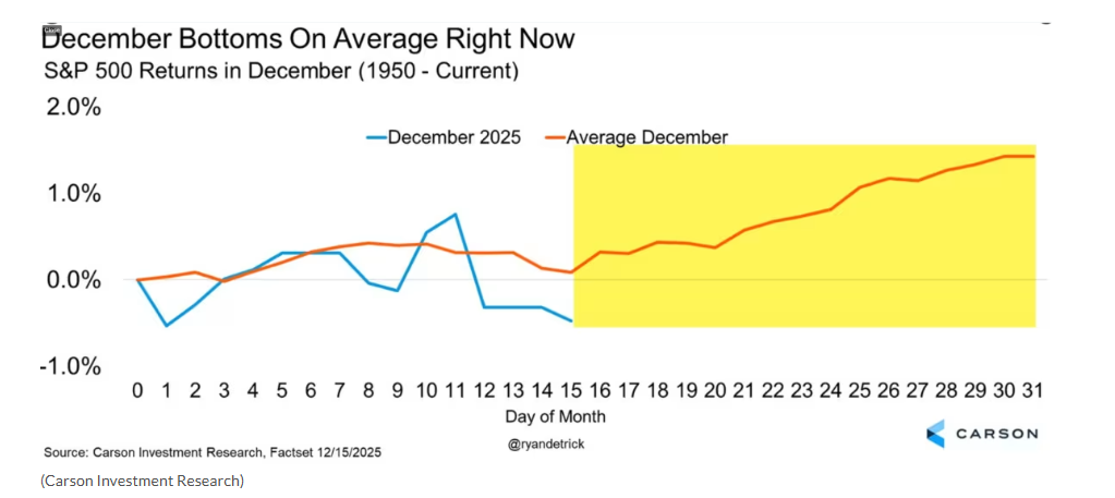 周二标普500指数连续三日下跌,本月迄今已下跌0.48%。不过,这种状况可能即将发生变化。Carson Group首席市场策略师瑞安·德特里克表示,根据他的一张图表,自1950年以来,标普500指数在12月的平均走势显示出类似规律。