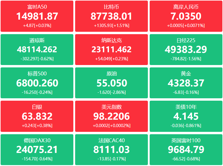 期货:现货黄金跌0.03%报4303.69美元,黄金期货跌0.03%报4333.70美元;现货白银跌0.47%报63.7843美元,白银期货涨0.36%报63.815美元;铜期货跌0.89%报5.3640美元,现货铂金涨2.99%,现货钯金涨2.21%;原油期货跌1.55美元,跌幅2.73%报55.27美元,布伦特原油跌1.64美元,跌幅2.71%报58.92美元;天然气期货跌3.14%报3.8860美元,汽油期货报1.6809美元,取暖油期货报2.1286美元。