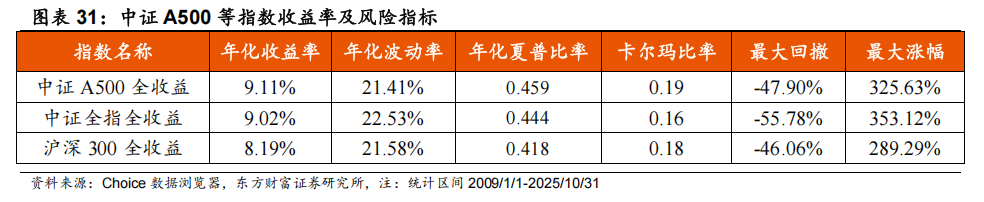 收益表现来看,中证A500指数历史业绩优异,牛市行情较沪深300具备更高上涨弹性,熊市行情中则有抗跌性,长期年化收益率表现出色,跑赢部分宽基指数。数据统计显示,自2009年11月1日至2025年10月31日,中证A500全收益年化收益率9.11%,最大涨幅325.63%,均优于同期沪深300,最大回撤与沪深300指数相当。