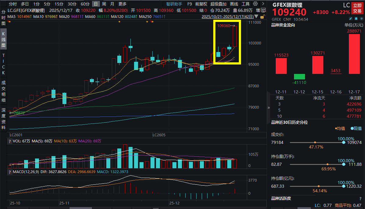 12月17日,碳酸锂期货主力盘中强势拉升,盘中涨幅超8%,创2024年6月以来新高,今年已累计涨超37%。消息面上,继宁德时代枧下窝矿被关停后,“亚洲锂都”宜春又现大动作,宜春市自然资源局拟对高安市伍桥瓷石矿等27宗采矿许可证予以注销