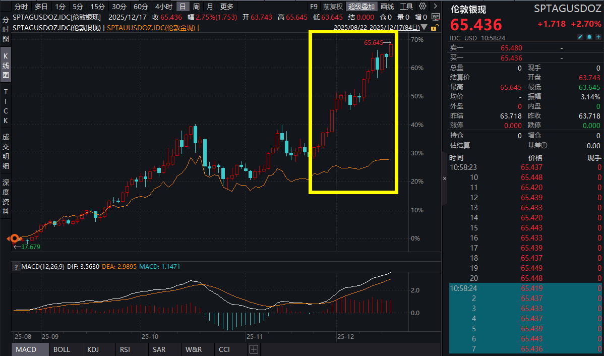 今日早盘,现货白银突破65美元/盎司,再创历史新高,日内涨超2%。现货黄金早盘一度突破4320美元/盎司!摩根士丹利表示,白银的投资需求或将持续占据主导地位,库存处于低位的情况下,现货市场存在出现逼仓行情的可能性。