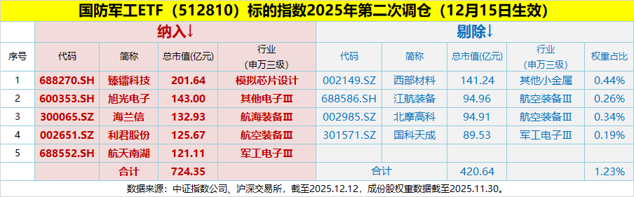 新纳入成份股:臻镭科技、旭光电子、海兰信、利君股份、航天南湖。