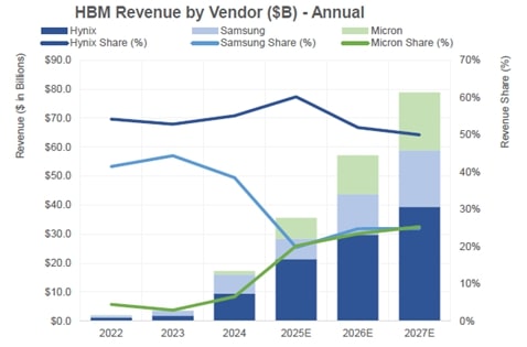 美光相对较晚进入HBM市场,于2023年才开始有意义的生产。尽管如此,该公司展现出卓越的管理执行力,即使初始产能有限也迅速获得市场份额。一旦通过正在进行的晶圆厂扩建,产能瓶颈得到充分解决,美光HBM业务的规模有望大幅扩张。当前HBM市场份额估计显示,SK海力士以60%的市场份额领先,其次是三星和美光,各占20%。然而,美光的市场份额正在迅速增长。SK海力士主要凭借其先发优势占据主导地位,但美光和三星的份额将随着时间的推移逐渐增加。