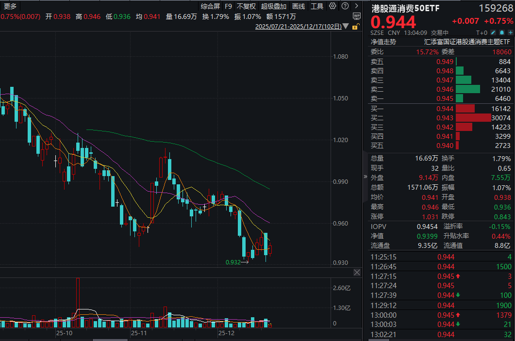 今日(12.17),沪指小幅反弹,大消费盘中翻红,消费ETF(159928)涨0.38%,盘中成交额已超2.3亿元!资金连续涌入,昨日全天流入超1.6亿元,今日盘中再获净申购1000万份!