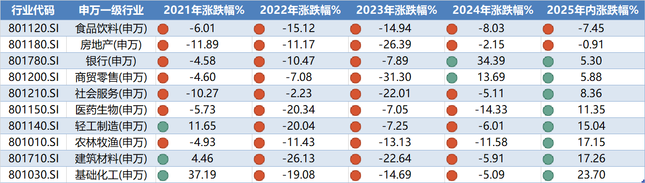 从过去5年的行业趋势来看(截至今年12/16),申万31个一级行业中,仅食品饮料和房地产连续5年下跌。而横向参考其他行业板块,在连续下跌3~4年后往往有所反转,例如今年以来涨幅亮眼的基础化工、医药生物等,都曾连续调整超过3年。