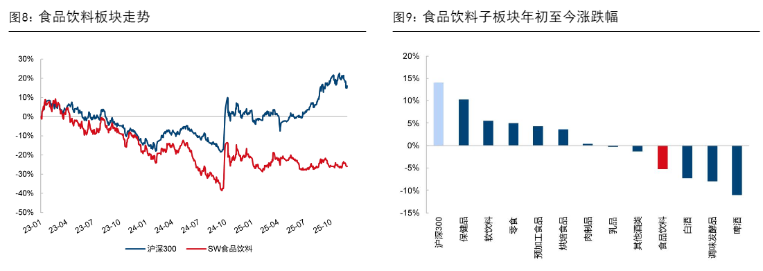 国信证券指出,回顾2025年,内需相对疲弱,行业整体降速。2025年前三季度中国城镇居民人均可支配收入同比增速4.4%,增幅放缓,消费信心未有明显修复,年中限酒条例亦形成短期扰动。受此影响,2025年食品饮料板块继续表现弱势,2025年年初以来,食品饮料板块下跌5.3%,跑输沪深300指数19.4个百分点。子板块中,软饮料行业维持相对较高的景气度,零食行业呈现分化表现,量贩零食龙头继续开店、魔芋零食放量形成局部亮点,相关板块表现良好。