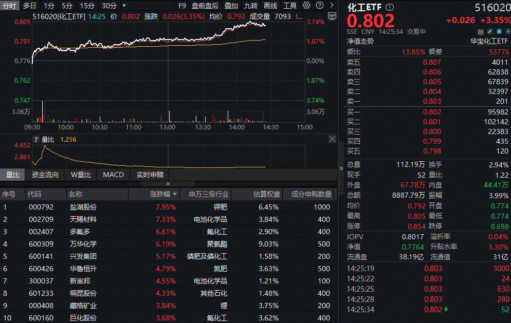 化工板块持续猛攻。反映化工板块整体走势的化工ETF(516020)盘中场内价格最高涨幅达到3.74%,截至发稿,涨3.35%。
