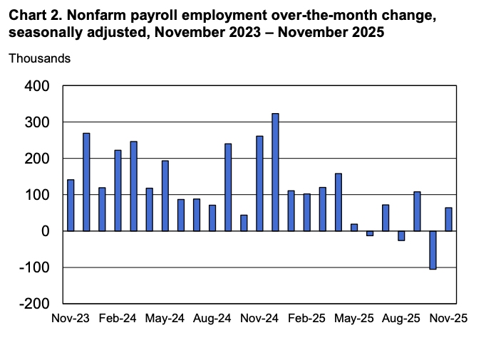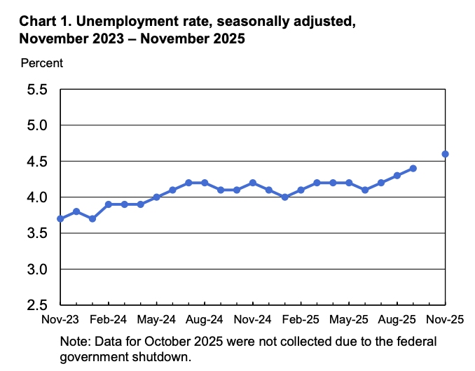 TradingKey - 美国劳动力市场在2025年11月展现出喜忧参半局面。一方面,非农就业岗位新增6.4万个,略高于市场预期的5万个,结束了前月大幅负增长的局面;另一方面,失业率意外升至4.6%,创下2021年9月以来最高水平。