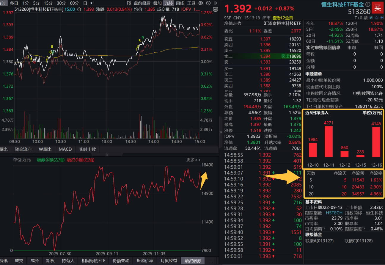 同类唯一15BP最低档管理费的恒生科技ETF基金(513260)亦收涨近1%,全天成交额近5亿元。资金面上,已连续34个交易日获资金青睐,累计净流入超5.4亿元!恒生科技ETF基金(513260)最新规模69.62亿元,融资客亦连续增仓,基金最新融资余额超1.7亿元!