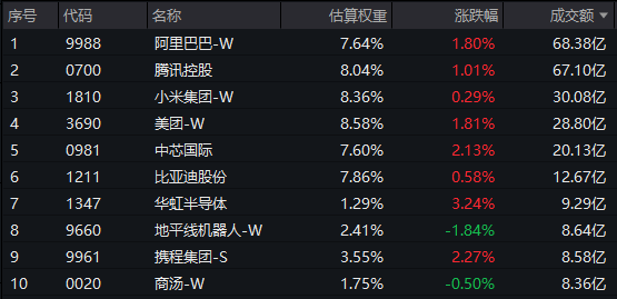 注:以上为恒生科技指数成分股,仅做展示,不作为个股推介。