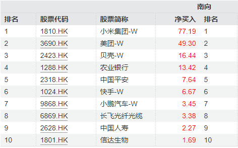南向资金持续流入港股科技板块:小米集团-W近七日累计获77.19亿港元的净买入,位居南向资金近7日净买入榜首!美团-W、快手-W、小鹏汽车-W也均位居近7日南向资金净买入榜前十。