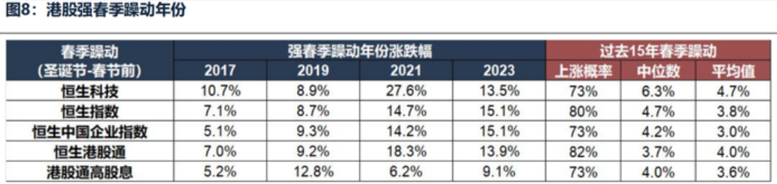 从历史数据看,港股春季躁动(圣诞节前-春节前)与A股春季躁动时间(春节后-重要会议期间)有明显时间差异。过去十五年,港股春季躁动期间,恒生科技和上涨概率分别为72.7%和80.0%,涨幅中位数分别为6.3%和4.7%,涨幅均值分别为4.7%和3.8%。