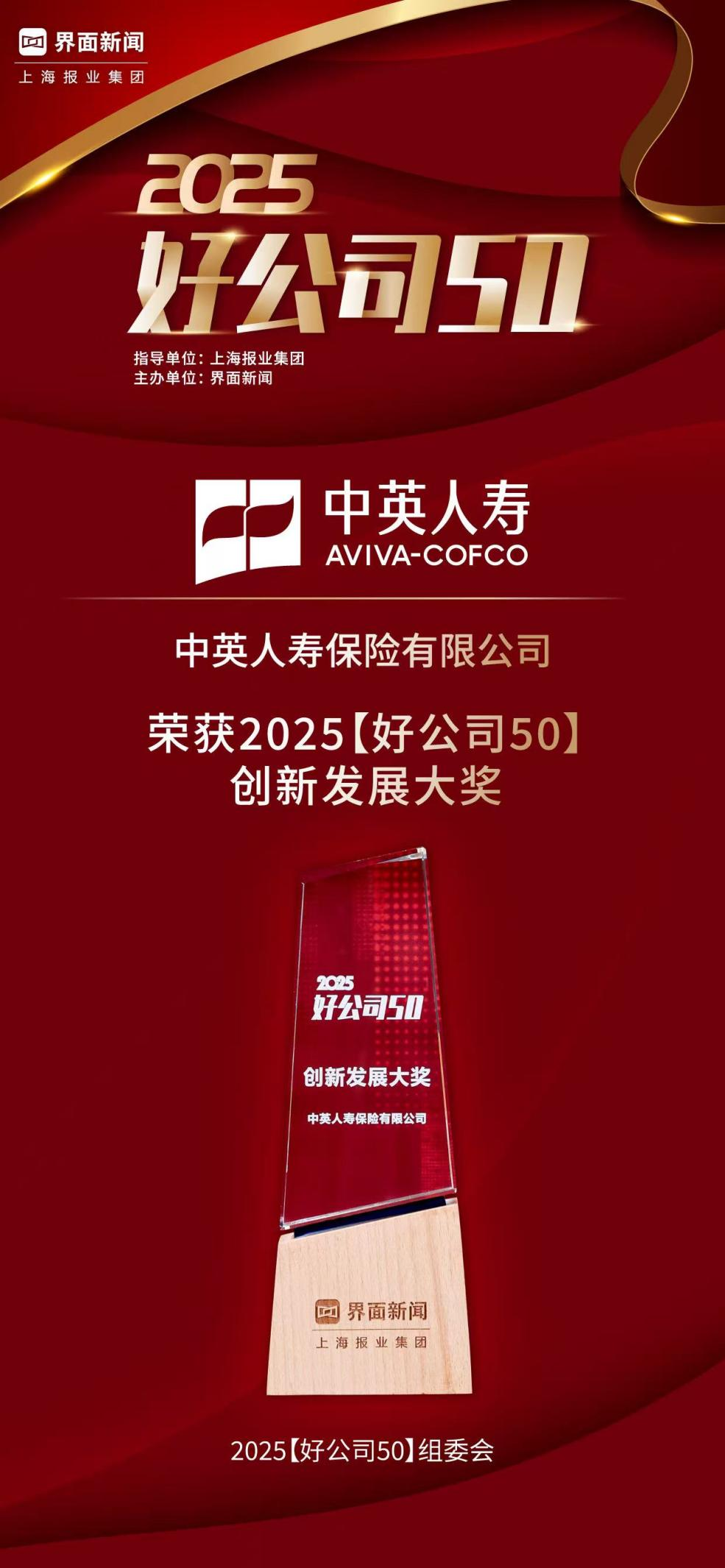 其中,中英人寿保险有限公司凭借其从“产品驱动”向“生态引领”的系统性创新实践,荣获【2025好公司50】创新发展大奖。